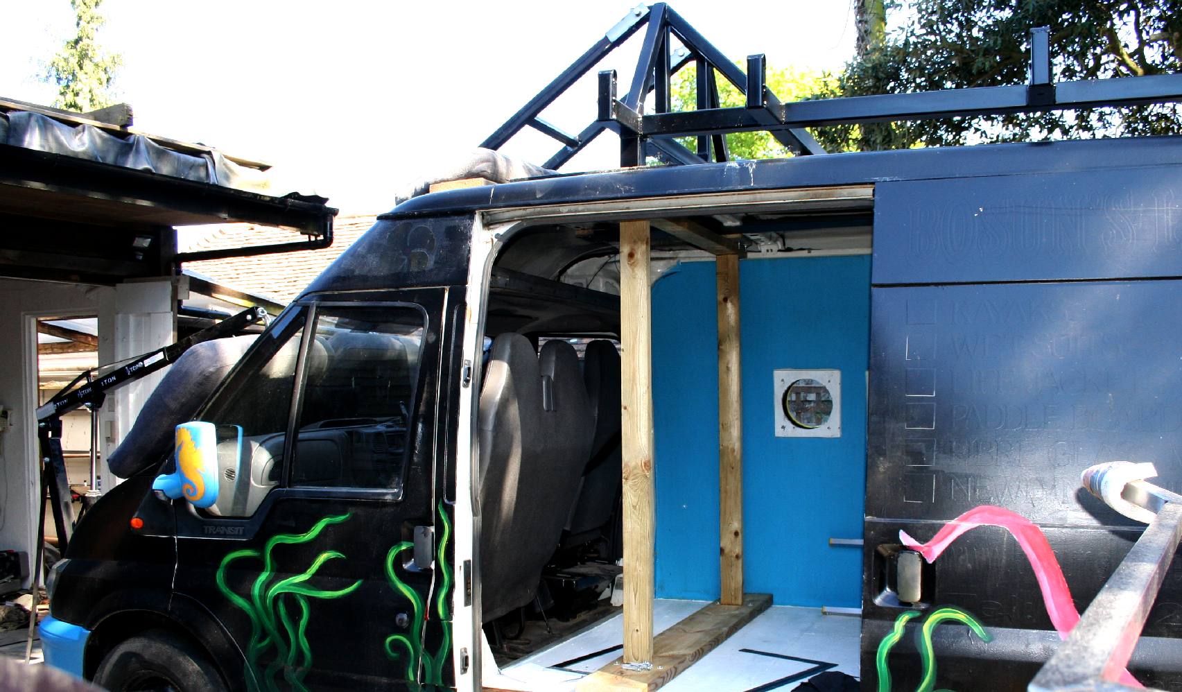 LOAD TRANSFER: To support the roof loads from above, a timber frame was fitted inside the van, also to act as a jig for a steel frame.